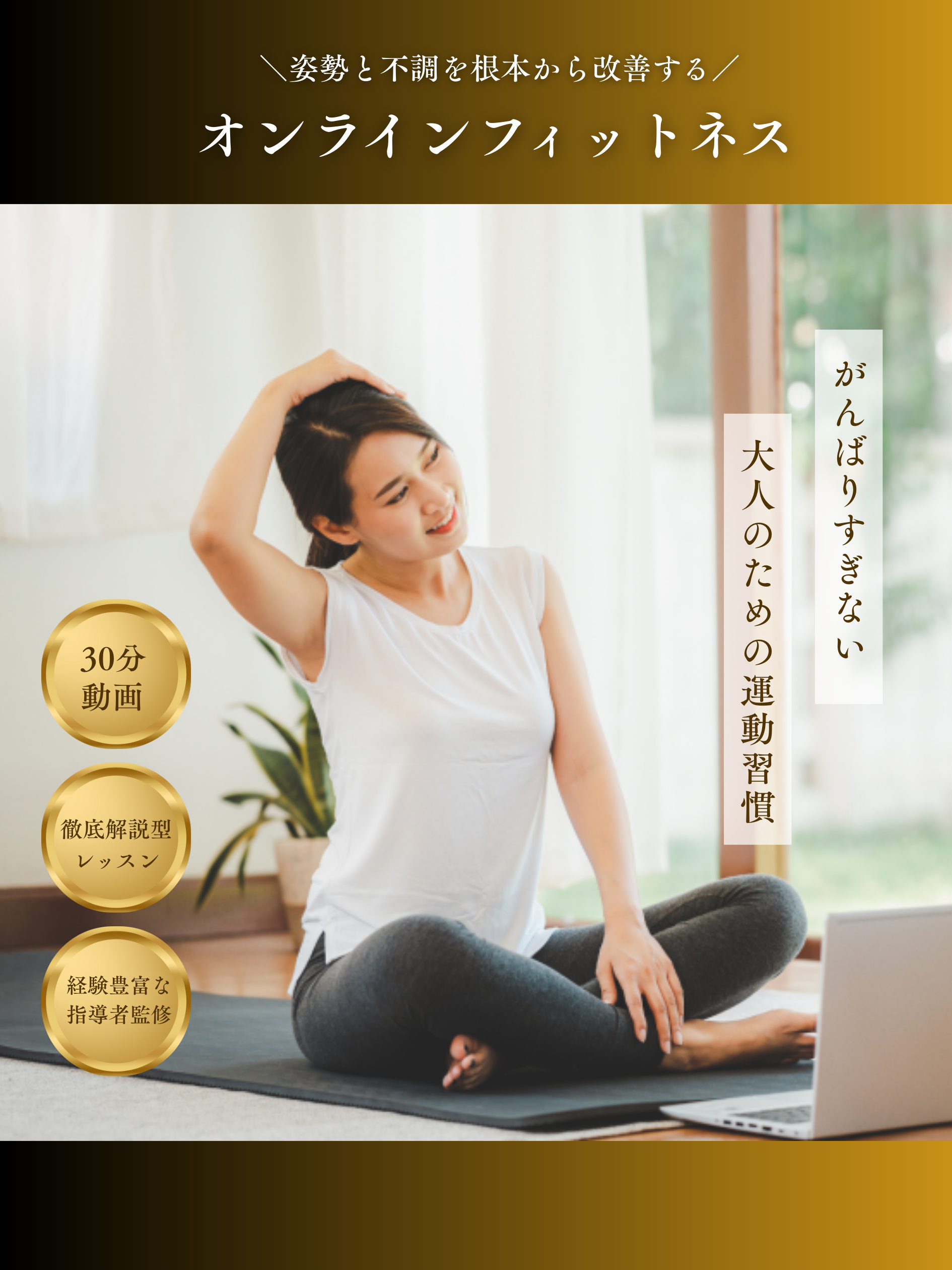 仕事が忙しい世代こそ、不調を抱えやすく、身体のコンディションが仕事のパフォーマンスを左右します。忙しいからこそオンラインでスキマ時間に続けられる「30分」で本当に必要なエクササイズだけを厳選して、カラダを根本から整えていきましょう。
